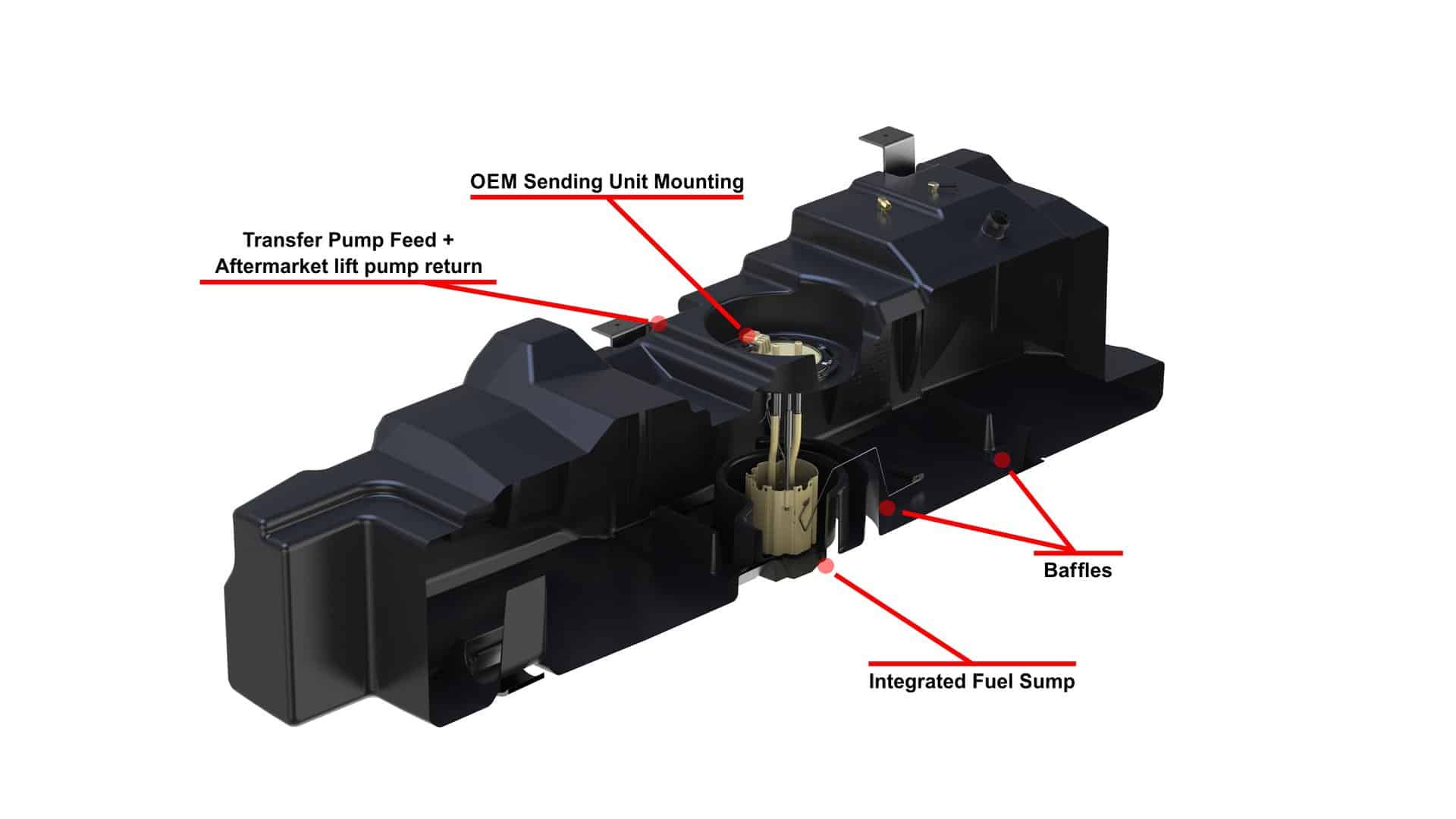 This 56 gallon fuel tank replaces the OEM 26 gallon fuel tank. The tank sits 2.4″ below the OEM fuel tank. Install can be done in 2-3 hours and does not require any cutting, drilling or modification. Install can be done in 2-3 hours and does not require any cutting, drilling or modification.