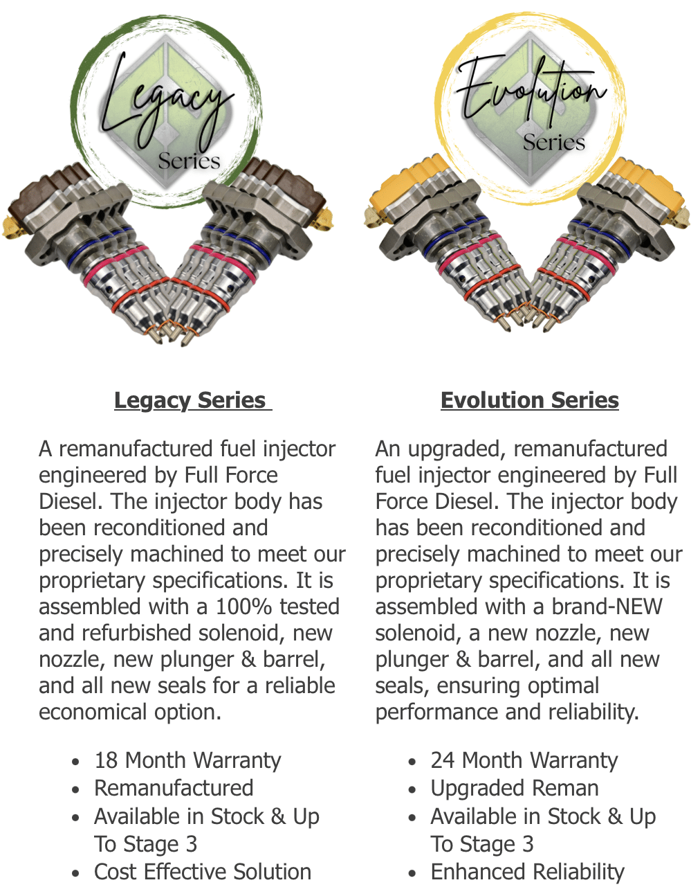 Evolution SeriesAn upgraded, remanufactured fuel injector engineered by Full Force Diesel. The injector body has been reconditioned and precisely machined to meet our proprietary specifications. It is assembled with a brand-NEW solenoid, a new nozzle, new plunger & barrel, and all new seals, ensuring optimal performance and reliability.